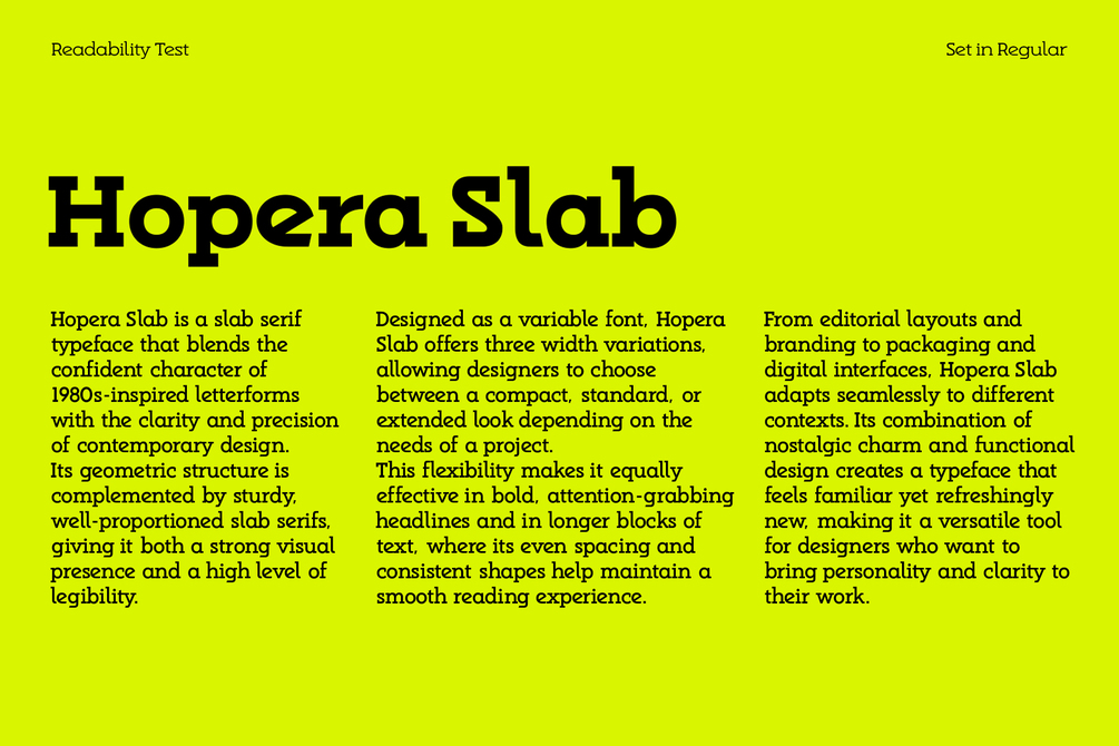 Designed as a variable font, Hopera Slab offers three distinct width options, allowing designers to fine-tune its presence for headlines, branding, editorial layouts, or digital interfaces. The slab serifs add a confident, grounded feel, while the clean proportions ensure versatility across print and screen. Hopera Slab bridges the gap between nostalgic charm and modern functionality, making it a typeface that feels both familiar and refreshingly new.